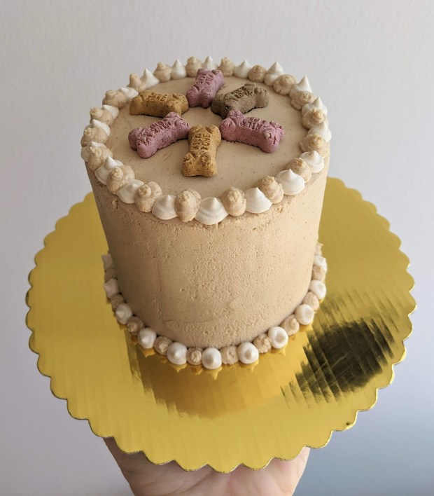 Dog cakes are $30 and come with 3 layers of peanut butter carrot cake. The cakes are 4″ and “serve” about 4 big slices (or 8 big dog treats).